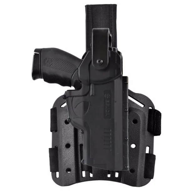 - Possui catraca rotativa, permitindo a angulação do Coldre em sua base, facilitando o manuseio da arma;